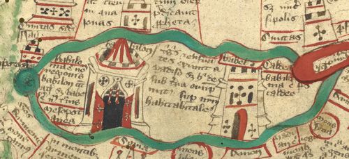This description of time as a geographical feature connects temporal movement, often seen as linear and narrative (at least in many Western cultures), with the more spatial and visual. Since the frame of The Canterbury Tales is a travel narrative, this connection between narrative and landscape makes sense. Medieval travel narratives, all along the spectrum from real to fictional, follow a model of connecting locations to stories of things that have happened there (or may have happened there). And my travel the week before had been the same. The part of the gorge leading to Seljalandsfoss, for example, is named Troll’s Gorge for an old troll woman who tried to cross it. Other places I visited connect to people and events from the sagas, and the sagas in turn are consistently connected to topographical features that we can visit today. A hill or city or waterfall links us with things that happened there a thousand years ago. Travel narratives more generally serve to yoke stories and locations. Medieval mappae mundi take this connection even further, collapsing past and present by presenting all of their details in